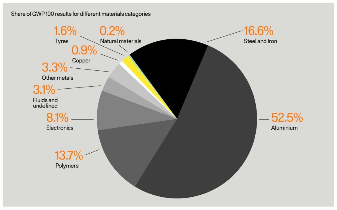 According to Polestar’s analysis, 60 per cent of the cradle-to-gate climate impact is due to the materials used in the vehicle’s production, which excludes the battery modules. A smidge over 50 per cent of the materials emissions comes from aluminium, with steel and iron accounting for another 17 per cent.