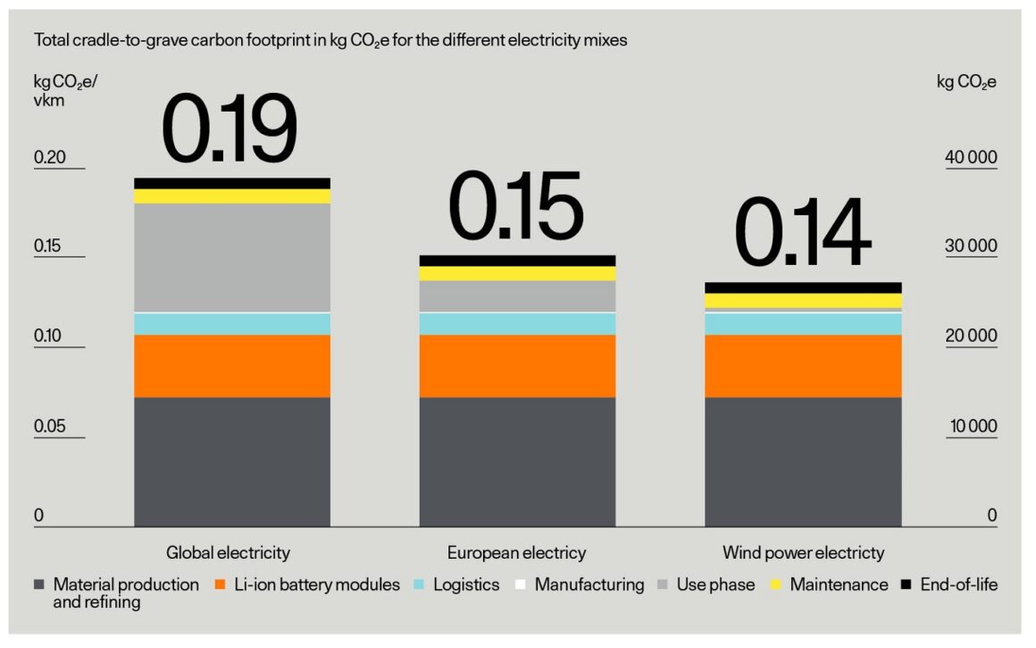 The full vehicle life cycle, which includes cradle-to-gate and then a further 200,000 kilometres driving plus end-of-life treatment, works out to 28.5 tCO₂e using the European electricity mix, but skyrockets to 38.6 tCO2e if manufacturing were to rely on the global electricity mix.